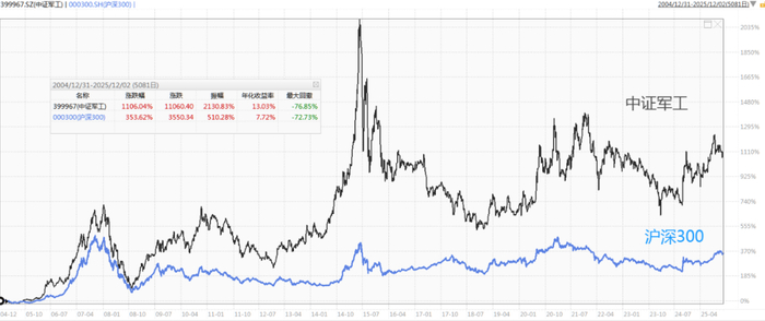 后面几个板块都验证了,但中国的军工板块还未受到市场重视,虽然中证军工长期确实也跑赢沪深300。(2004-12-31至2025-12-2)