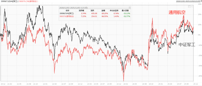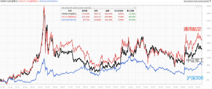 下图是国证通用航空产业指数(黑线)基日至今的表现,长期走势和中证军工接近,但表现更优,可以视为军工增强资产。(2012-6-29至2025-12-2,数据来源:Wind)