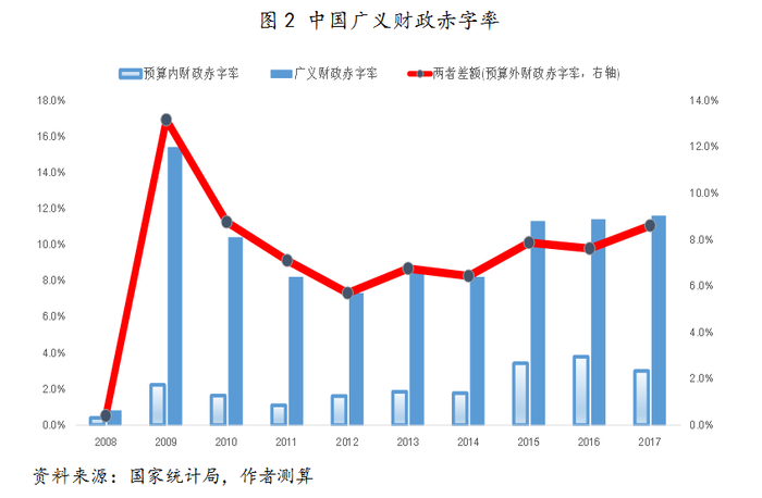 广义上的现代货币理论在中国的实践在学术界存在一定的争议,本文并不争论概念,从广义的角度阐述近年来现代货币理论在中国的类似的实践。现代货币理论在中国的实践过去更多的表现为,央行发行的货币通过商业银行等机构,为地方政府债务进行融资和为国有部门的部分债务进行过度的融资。比如说广义财政赤字方面,按照我们的测算,2009-2017年,中国实际的广义财政赤字率较官方公布的预算内赤字率平均高7.2个百分点,其中差异最大的时期出现在全球金融危机期间和2016-2017年。我们将政府债务分为中央和地方两部分考察,中央财政赤字部分总体可控,地方政府债务问题较为突出。关于地方政府债务存量的部分,我们的数据分析发现,将2009-2017年间测算的地方广义财政赤字净加总,目前地方政府累计债务总规模已经达到了39万亿元。