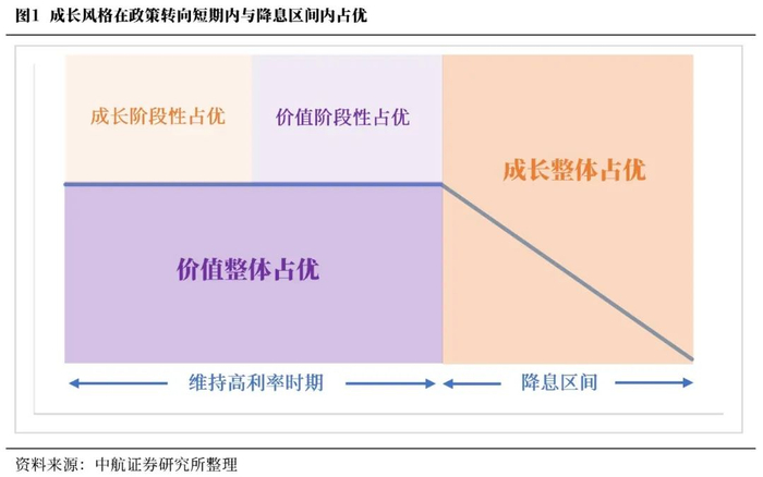 首先,假设仅考虑美国货币政策对国内市场的影响。我们通过美国联邦基金目标利率判断调息周期中的加息区间、维持高利率时期、降息区间、以及维持低利率时期,分别观察在停止加息后维持高利率时期和降息区间的市场表现。可以发现在停止加息后短期内小盘成长风格占优,但随着市场对流动性拐点利好的消化,小盘成长风格弹性减弱逐步让位大盘价值,停止加息后维持高利率区间整体来看大盘价值风格表现占优。另外,在降息区间内中小盘成长风格表现较强。