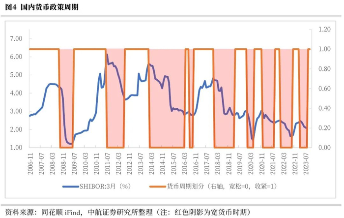 其次,我们回顾了历史上美联储货币政策转向宽松且国内也采取宽货币政策时期的市场表现,发现这一阶段成长风格表现较强。海外方面,为确保样本数量,我们整体统计末次加息后的维持高利率时期+降息区间。国内方面,我们采用3个月SHIBOR利率指标为主,政策信号为辅的方式更加客观地量化货币周期的宽松与紧缩。经过统计,共得到三个国内采取宽货币且美国处于货币政策转向宽松区间,经统计可以发现在各个时期内成长风格表现较强,中小盘指数强于大盘指数。