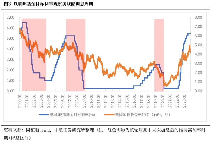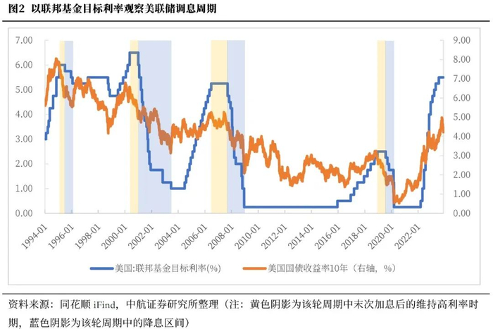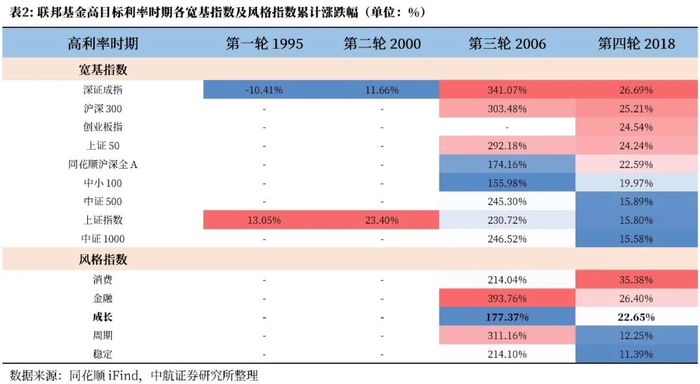 首先,假设仅考虑美国货币政策对国内市场的影响。我们通过美国联邦基金目标利率判断调息周期中的加息区间、维持高利率时期、降息区间、以及维持低利率时期,分别观察在停止加息后维持高利率时期和降息区间的市场表现。可以发现在停止加息后短期内小盘成长风格占优,但随着市场对流动性拐点利好的消化,小盘成长风格弹性减弱逐步让位大盘价值,停止加息后维持高利率区间整体来看大盘价值风格表现占优。以每轮周期最后一次加息看作政策转向时点,观察美联储最后一次加息后在高利率区间内5个、20个、60个和120个交易日内的市场表现,发现政策转向后越早期小盘成长风格表现越突出,此后逐渐被金融及消费赶超。观察维持高利率整体区间内,各宽基指数普遍上涨,其中代表大盘价值风格的沪深300、上证50涨幅排名靠前,风格指数中消费、金融风格占优。在降息区间内中小盘成长风格表现较强,无论是在2007-2008年受金融危机影响各宽基指数普遍下跌的背景下,还是在2019年美国对中国高新产业制裁加剧的考验下,偏中小盘成长风格的中小100、中证500、中证1000表现均相对较好,风格指数中成长风格表现较强。