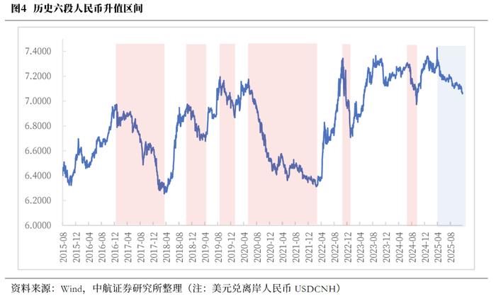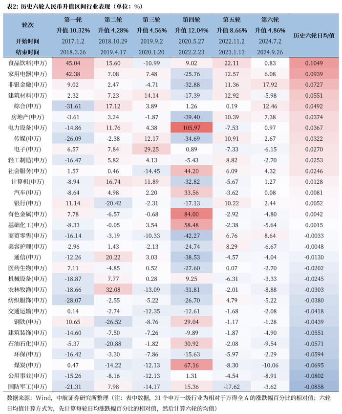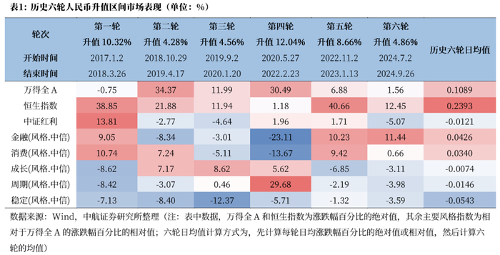 过去六轮人民币升值区间中国股票市场胜率高,A股、港股多数表现为上涨。其中,港股略强于A股。A股结构上,平均来看,金融、消费风格占优,食品饮料、家用电器、非银金融等行业具有较为明显的相对优势,更受外资青睐。
