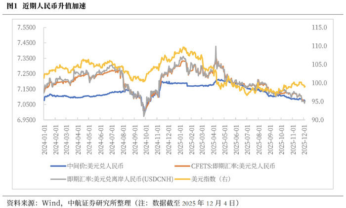11月以来,人民币在美元指数较为强势的背景下,兑美元持续升值。我们认为这主要因,外部,中美经贸环境稳定性明显提升,叠加年末结汇需求;内部,“十五五”规划为未来中期指明方向,国内基本面稳中提质;同时,央行也对汇率升值积极引领。美元对人民币中间价、在岸和离岸即期汇率均出现明显突破。周中12月3日,离岸美元对人民币降至7.0583。人民币对美元汇率近期升值加速是多重因素共振的结果。外围因素方面,中美关系改善,10月底中美吉隆坡经贸磋商达成一致,双方对部分关税和出口管制等措施暂停一年,未来一年出口不确定性大幅缓解;叠加今年出口整体平稳增长,年末结汇需求较高,推动近期人民币走势。内部,“十五五”规划建议承前启后,再次明确“坚持以经济建设为中心”,并以推动高质量发展为主题,为未来中期发展路线指明方向,全球资金对中国信心提升;国内基本面稳中提质,为人民币走强提供内在支撑;此外,人民币中间价延续偏强态势,对即期汇率升值起积极引导,同时11月24日,央行发行离岸央票,政策层发力稳定汇率预期,也为人民币升值提供了有力支撑。