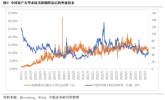 中国资产有望承接美联储降息后的外流资金。近期中国5年期主权CDS利差已从2025年4月8日的全年高点83.42BP回落至12月4日的43.40BP,显示国际市场对于中国国债违约风险的定价大幅降低,对于中国资产的信用状况认可度大幅升高,海外资金看多中国的情绪升温,外资流入中国资产的意愿更加强烈。市场参与度方面,陆股通成交额占万得全A成交额比例较年中回升,6月占比11.12%,11月已回升至11.56%,9月一度达到12.84%。美联储宽松周期有望延续的宏观背景下美元资产收益降低,中国央行保持货币政策的独立性,投资中国资产的收益率更高,更加凸显其性价比。