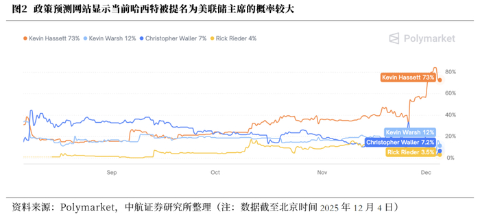 海外方面,美联储主席将于明年换届,凯文·哈西特当选概率或较大,若其当选则未来美联储降息周期或将更为明确。当地时间12月2日,美国总统特朗普表示,他很可能在2026年初公布美联储新任主席的人选。而在主席人选方面,目前综合来看,白宫国家经济委员会主任凯文·哈西特(Kevin Hassett)当选概率或较大。此前彭博社援引知情人士消息称,在特朗普及其顾问和盟友眼中,哈西特是下任美联储主席的头号候选人;而当地时间12月2日同日晚间,特朗普在白宫活动上也暗示,哈西特可能会是潜在的美联储主席人选。当前市场对哈西特被提名为联储主席的预期较高,截至北京时间12月4日,政策预测网站Poly market的数据显示,在谁将被特朗普提名为美联储主席问题中,哈西特当选概率为73%,远领先于第二位的凯文·沃什(12%)。从哈西特政策主张上来看,其货币政策立场偏鸽,与特朗普关系紧密,曾表态支持特朗普的关税的政策和呼吁降息的观点。