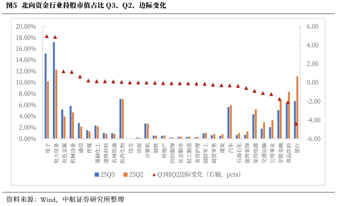 2025年三季度北向资金重仓的前五大行业分别为电力设备、电子、医药生物、银行、食品饮料。从边际变化来看,本轮北向资金三季度较二季度主要加仓中国的科技方向,前五大加仓行业分别为电子、电力设备、有色金属、机械设备、通信。其中,电子和电力设备在二季度便均为北向资金重仓方向,三季度延续位居前列,且边际加仓亦居榜首,显示出外资对中国科技方向的持续看好,对中国科技资产认可度进一步提升。