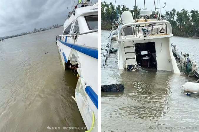 2024年09月,超强台风“摩羯”在海南省登陆,导致锚泊在**港的标的游艇“**号”走锚,且被其他物体猛烈撞击,船壳多处破损,最终在清澜港东郊码头旁搁浅,机舱被水淹没,船艏厨房位置严重破损。