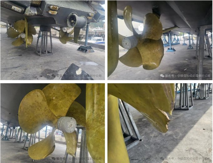 2024年2月某日下午游艇“****”在航行途中,感觉船体有震动,螺旋桨好像触礁石了,船长立即关闭两台主机,到机舱检查是否有漏水现象,检查后未发现漏水情况发生,就呼叫私家摩托艇进行救援,利用私家摩托艇结浪涌的情况使出险游艇慢慢移开了触礁位置,随后重新启动主机,检查没有漏水情况后,在摩托艇引航的情况下待速开回青梅港口停泊,次日上午报保险公司处理。2天后出险游艇在**市**码头上排检查,检查时发现出险游艇左边螺旋桨两片扇叶严重变形,其中一片扇叶A区严重变形、B与C区连接口处变形,背面整体变形,另外一片扇叶B区变形;右边螺旋桨两片扇叶受损,其中一片扇叶C区开裂约5cm及C区背面变形,另外一片扇叶B区至C区背面整片有轻微得缺失,深度约0.3cm;左边美人架严重变形,连接处整体断裂,右边美人架轻微变形;左右两边轴承及舵叶变形。