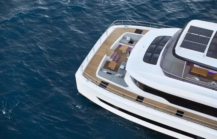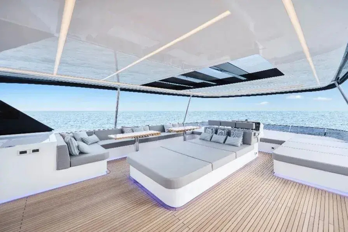 Vista 75双体游艇,将绿色理念深植于每一处设计细节,其飞桥硬顶选配的30m²太阳能发电系统堪称“海上绿色能源核心”, 同时配置100度锂电池储能系统,在锚泊状态下,可实现全艇能源自给自足,覆盖照明、家电,空调,运行等全场景用电需求。