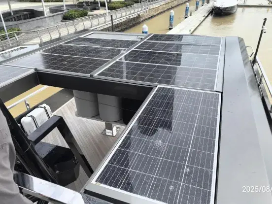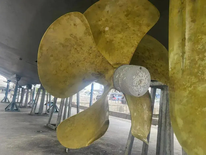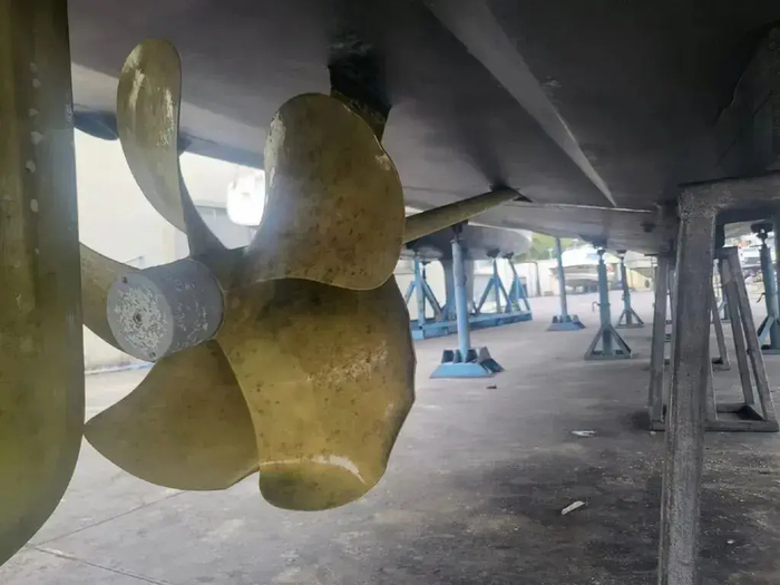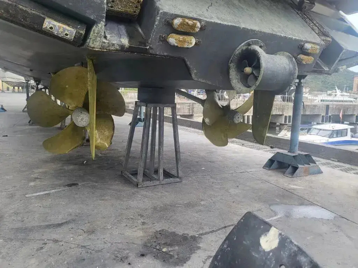 1、左舷螺旋桨不锈钢材质,直径550mm,型号M8,采用双螺旋桨型式前四后五叶片,未见前端螺旋桨。