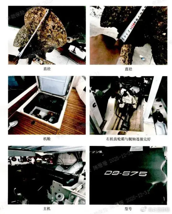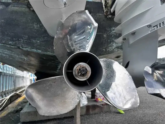 1、该游艇船底完好未见有磕碰迹象,左舷螺旋桨未见受损,右舷螺旋桨叶片有卷边现象。