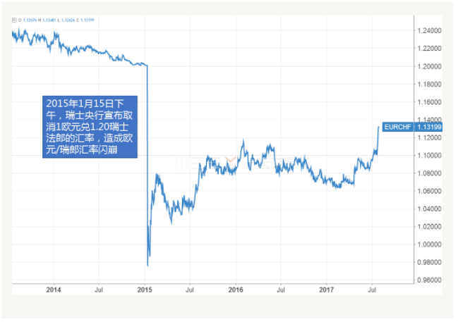 2015年1月15日瑞士央行意外宣布放弃欧元兑瑞郎1.20汇率下限,而讽刺的是就在一个月前瑞士央行主席还信誓旦旦表态“要尽最大努力”捍卫欧元兑瑞郎汇率下限,瑞士央行声明之后,外汇市场上瑞郎兑欧元暴涨近30%,美元、欧元跳水;避险资产黄金大涨突破1250美元/盎司;欧元/美元随后重挫逾百点,最低触及1.1600水平,多头已然“无力回天”,瑞士央行对此解释称,“主要央行之间的政策分歧已经显著扩大,而且这一趋势极有可能得到进一步加强。欧元兑美元大幅走低,并带动瑞郎兑美元显著回落。在这种形势下,瑞央行认为设定欧元/瑞郎下限的政策已经不合时宜”.“进一步下调负利率水平、利率目标区间,是为了防止欧元/瑞郎汇率下限被取消后可能出现的货币环境收紧