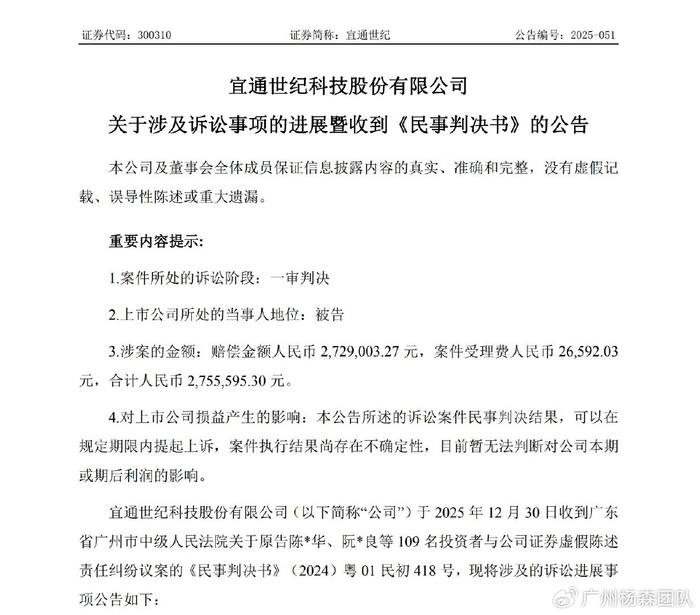 2025年12月30日,宜通世纪300310披露关于涉及诉讼事项的进展暨收到《民事判决书》的公告,法院判决公司赔付109位投资者损失失2729003.27 元。目前,案件为一审判决,尚未生效。