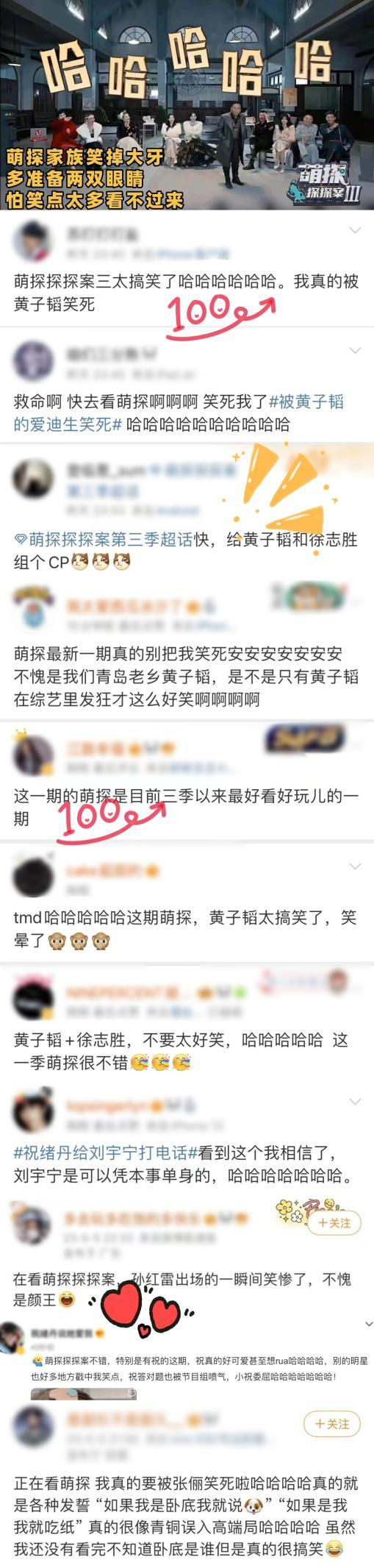 徐志胜“绝美大帅哥”的爆梗从脱口秀玩儿到《萌探3》。本期徐志胜扮演的少爷徐胜儿惹宁静、孙千化身的《风声》双女主为其争风吃醋。面对谢娜对二人关系的质疑,宁静直言“情人眼里出西施,他是民国最后一个帅哥。”引全场嘉宾爆笑。此外还有众多令人眼花缭乱的情感关系。孙红雷、谢娜重现《潜伏》,演绎一场血海深仇的虐恋戏码,对戏期间孙红雷疯狂cue张杰,惹谢娜屡次破功;黄子韬、娜扎、祝绪丹、宋小宝上演“四角恋”,既有霸总追爱戏码,又有闺蜜横刀夺爱戏码,不得不令人拍手叫绝。