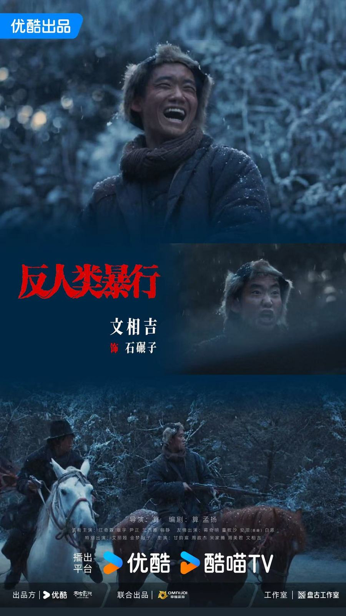 演员文相吉作为新生代演员,在《反人类暴行》中饰演抗联战士【石碾子】,坚毅勇敢的少年端持一杆长枪,自雪地策马而来,爽朗的笑容似乎看不出经历的苦难。在那个年代,即使石碾子仅有的食物是橡子面加磨碎的松针,他也会将食物大方地送给老乡们。石碾子的身上有少年一代的不可磨灭之意气,一言一语都有着对守护家园的坚定。少年是中国的未来,而石碾子便是那个时代千千万万少年之一。