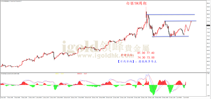 上图为白银1小时图。从形态结构看,白银处于高位宽幅箱体震荡形态结构中,短线支撑位71.25附近,早间多头跳空高开高走震荡向上,开启了反弹浪节奏。从k线看,多头上攻是连续阳线节奏,表明多头力量较强,后市继续偏多头新高走势。综合 MACD指标看,快慢线0轴金叉信号出现,表明多头将开启一波上涨浪行情。策略上建议顺多头反攻节奏找支撑位埋伏多单思路为主。