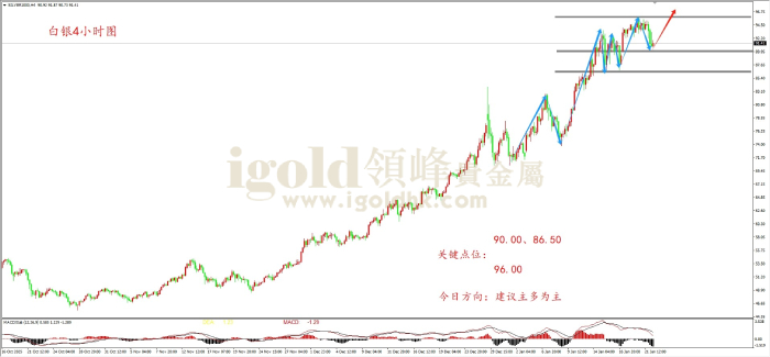 上图为白银4小时图。从波浪来看,白银当前处于自70.40一线开启上行的四浪整理之中,表现为震荡上行,可逢低布局第五浪上行。整体来看,白银保持着良好的强势单边上行趋势,高低点不断往上抬升。从下方MACD指标来看,在四浪调整期间,量能呈现缩量能整理。操作上建议逢低布局多单思路为主。