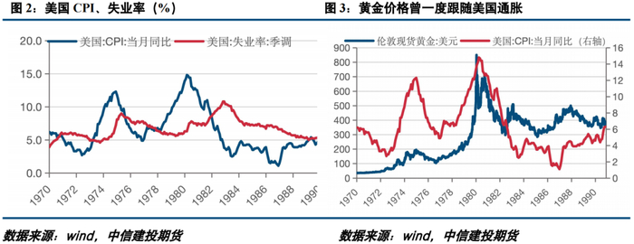 “牙买加体系”的确立后,黄金价格又迎来一轮上升期,这是因为新的国际货币体系的确立并未解决经济的深层次问题。20世纪70年代,以美国为首的西方发达国家出现了经济停滞与通货膨胀同时并存的新现象,“滞胀”这一新的经济难题给市场带来持续困扰。与大萧条时期的“低增长、低通胀、高失业率”不同,滞胀意味着“低增长、高通胀、高失业率”。在这一阶段,黄金基本跟随美国通胀而变化,成为了抗通胀的核心资产。