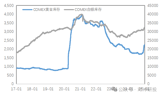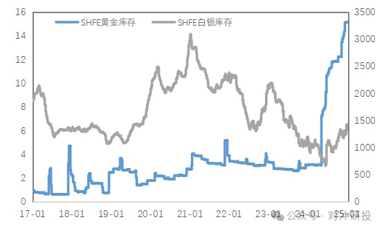 库存方面,上周COMEX黄金库存为4171万盎司,环比减少约150万盎司,COMEX白银库存约为49791万盎司,环比减少约120万盎司;SHFE黄金库存约为15.7吨,环比基本持平,SHFE白银库存约为924吨,环比减少约33吨。