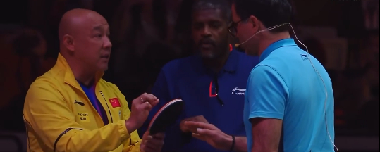 在比赛开始之前,场上出现了突发状况:在赛前检查球拍时,王楚钦发现自己的拍子出现问题,球拍的海绵存在开胶的情况,他立刻申请更换球拍再进行比赛。不过,当值主裁判认为王楚钦的球拍没有问题且可以正常进行比赛。在王楚钦和主教练与裁判组进行一系列交涉之后,王楚钦还是更换了球拍,比赛也随即开始。