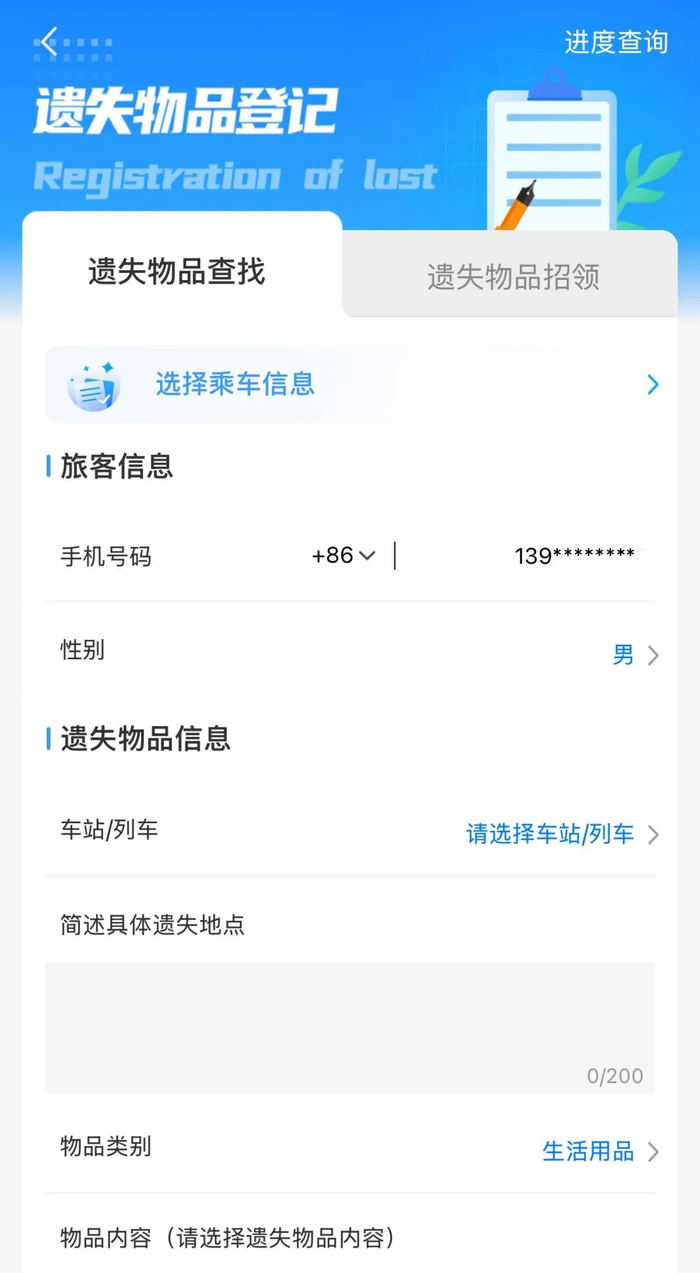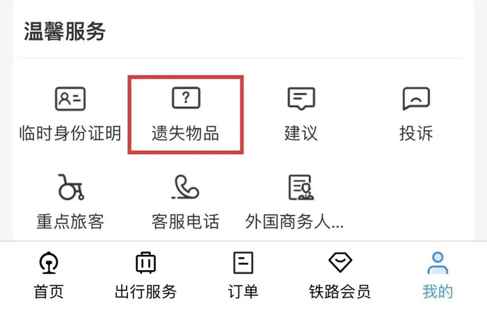 1.登录铁路12306App或官网。打开铁路12306App首页,找到右下角【我的】,点击“温馨服务”中的“遗失物品”,按要求填写相关信息。