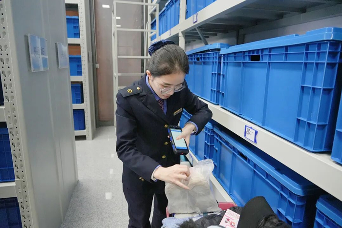 据介绍,智能仓库依托铁路大数据联网系统,打通12306平台、列车、车站信息通道,工作人员将接收到的物品信息录入遗失物品管理系统,生成二维码,粘贴到物品上,最后通过移动终端扫描、存放,物品信息与货柜区实现绑定。