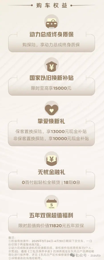 近期,东风日产为旗下中大型SUV探陆推出了一系列颇具吸引力的限时购车权益,活动从2025年3月24日持续至4月30日。这一举措旨在提升探陆的市场竞争力,在竞争激烈的中大型SUV市场中分得更大的蛋糕。