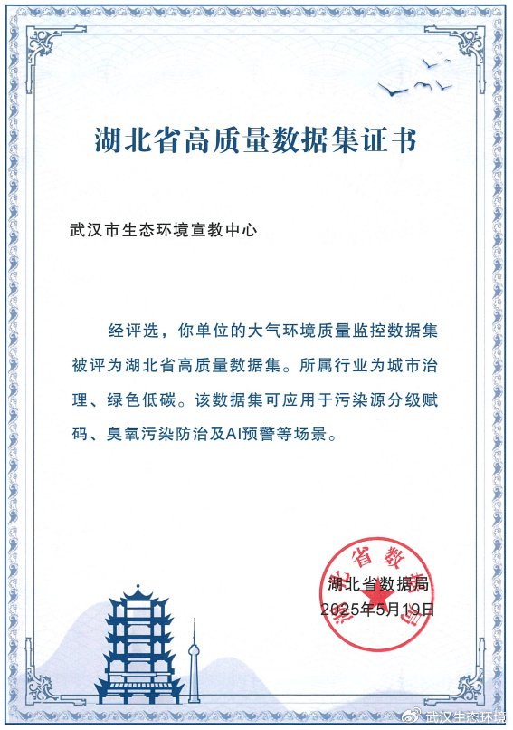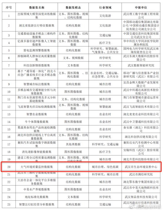 2025年5月26日,湖北省数据局公开发布《关于发布第二批湖北省高质量数据集的公告》,经专家评审推荐,武汉市生态环境宣教中心申报的大气环境质量监控数据集成功入选第二批湖北省高质量数据集名单。