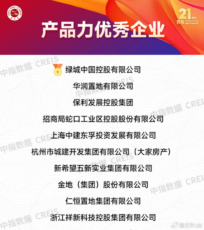 2024 年,中指院发布中国房地产百强企业研究成果,绿城连续第五年蝉联“产品力优秀企业TOP1”,并在“2023中国房地产交付力优秀企业”榜单中位列TOP2……