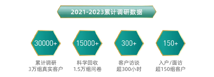 从2021年开始至今,绿城管理客研中心联动全国案场触达19省、3万组客户,高质量回收1.5万份问卷,入户观察、面对面访谈、样板房陪看等累计超过300小时……