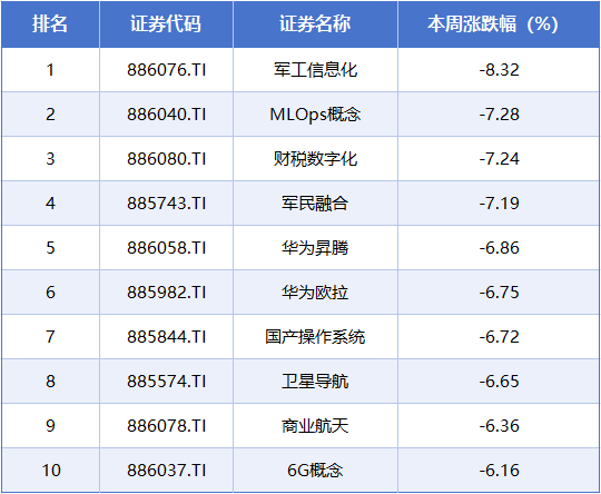 本周排在跌幅榜前排的概念板块分别是军工信息化、MLOps概念、财税数字化、军民融合、华为昇腾,累计跌幅分别为8.32%、7.28%、7.24%、7.19%、6.86%。