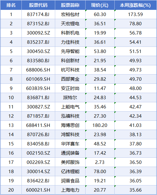 个股方面,本周个股涨幅榜前五位分别是宏裕包材、天宏锂电、科新机电、力佳科技、先导智能,累计涨幅分别为173.59%、78.80%、56.78%、54.41%、51.51%。