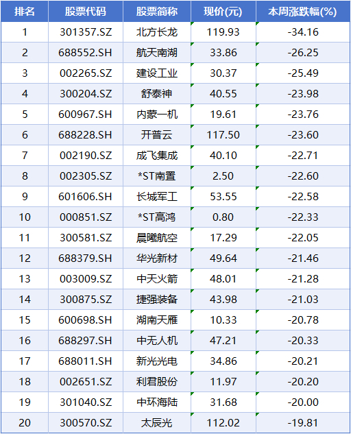 本周个股跌幅榜前五位分别是北方长龙、航天南湖、建设工业、舒泰神、内蒙一机,累计跌幅分别为34.16%、26.25%、25.49%、23.98%、23.76%。
