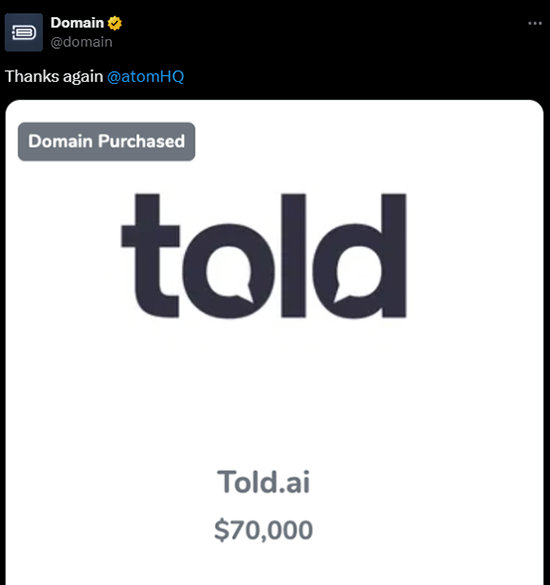 Told.ai 以 7 万美元成交的消息,为当下 .ai 后缀的市场关注再添一把火。从域名的角度看,这笔交易不仅体现了高质量英文词汇型域名在人工智能细分场景中的现实价值,也折射出近年来 .ai 后缀的品牌承载力、投资逻辑与流动性特征。卖家于 2022 年以约 120 美元购入,历经近三年的持有后成功转手,回报区间与持有周期在域名投资市场具有一定代表性:好名称的价值往往需要时间沉淀与场景成熟来共同催化。