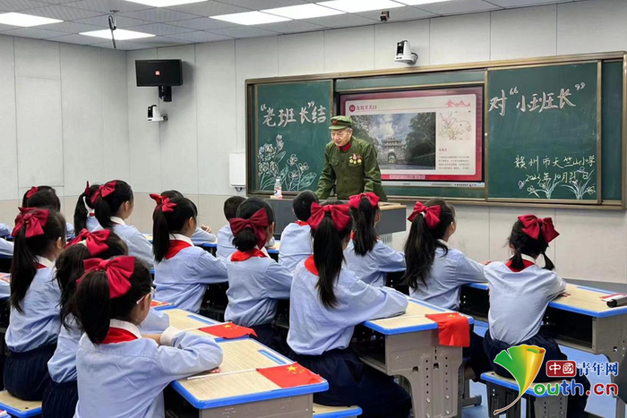老兵给学生们讲革命故事。王馨文 摄该区将红色文化有机融入校园文化建设,打造集红色文化、优秀传统文化于一体的校园景观,让校园处处充满红色精神,让学生在潜移默化中浸染红色基因,实现环境育人,并与知识学习、能力培育、价值观培育有机统一。红色元素融入校园文化中,红色文化处处能看得见、摸得着、感受得到。