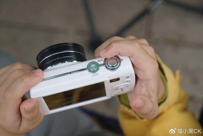 机身设计的细节处理更显用心。配色一共有黑白粉三种配色,我手上的这款是百搭的象牙白。金属质感的光圈环提升了产品辨识度,而普通卡片机多为单调的黑色塑料机身。