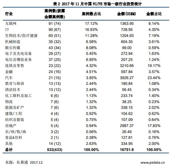 根据清科集团旗下私募通数据显示,2017年11月共发生投资案例532起,其中披露金额的案例433起,案例数环比增长73.3%,从投资金额角度看,11月份总投资金额167.52亿美元,平均投资金额3148.87美元,金额环比增加64.3%。11月投资环比大幅增长,已创本年度VC/PE市场投融资额新高。