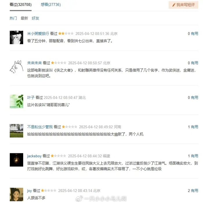 《射雕英雄传》这部在2025年春节档期上映的影片,最终取得了6.23亿元的分账票房。4月12日,其在各大正版视频平台上线刚满 1 天,豆瓣短评区域便出现了一个值得关注的现象。在短评的 “最新” 区域中,从11号以来影迷们的短评和打分近乎全是差评。即便偶有四星或五星评价,也大多带着反讽意味。
