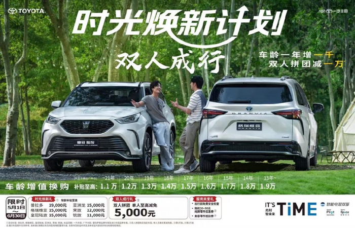 当然,一汽丰田的大招还不止于此,在延续时光焕新计划的基础上,5月启动的"双人成行"策略标志着营销模式向场景化纵深发展,通过官方团购金、拼团减免等创新玩法,将家庭购车、朋友换车等真实消费场景转化为营销触点。