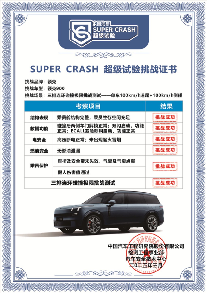 领克900凭借全球首创一体式热成型双门环结构、同级首个侧面ABCD柱热成型钢全覆盖等创新设计和严苛标准,带来同级领先的侧面、三排、后碰撞和电池安全防护,率先实现三排安全平权,刷新大六座SUV安全新高度,成为同级安全新标杆。