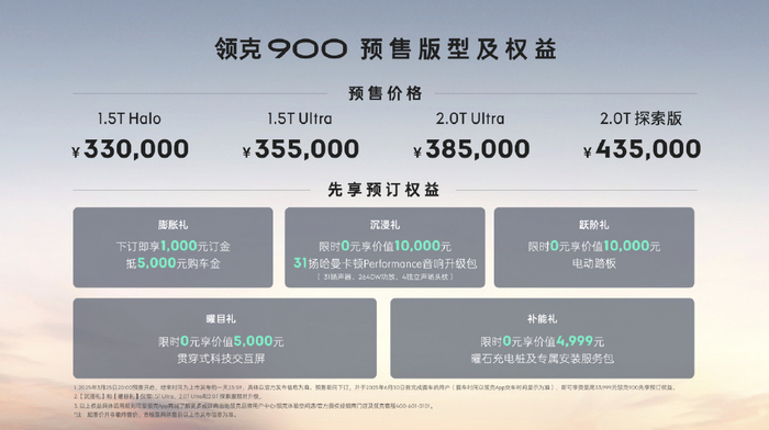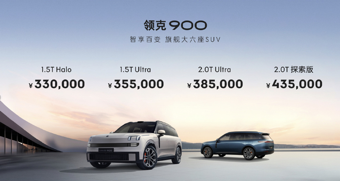 3月25日,领克900正式开启预售,共推出1.5T Halo、1.5T Ultra、2.0T Ultra 、2.0T探索版四大版本,预售价格为33万到43.5万元。