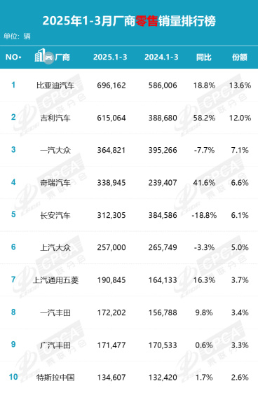 乘联会公布的今年前三个月零售销量数据显示,零售销量前十位的车企中,合资或外资品牌仍然占据半壁江山,不过前五名中自主品牌占据四席,自主品牌正在逐步成为市场主流。