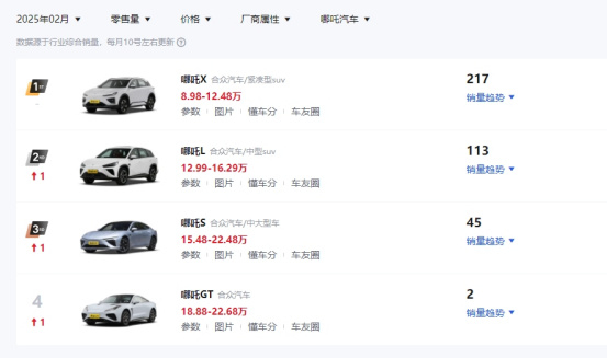 懂车帝数据显示,2025年2月,哪吒汽车多个车型的单月销量均只有数十辆或一百辆左右。