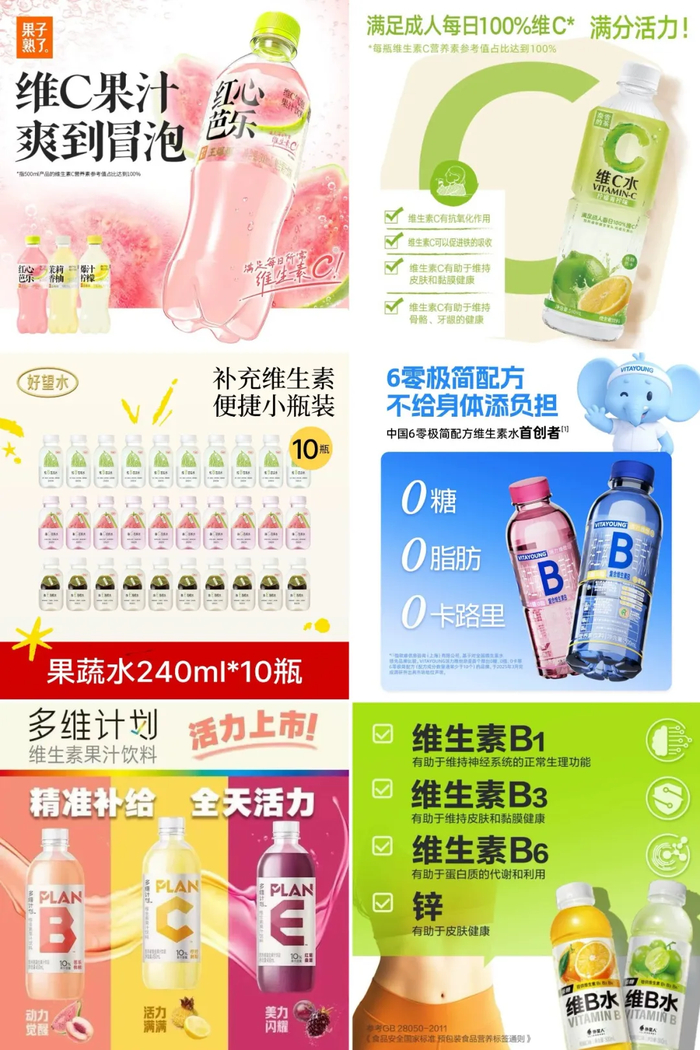 赛道火热,自然吸引了各路玩家入局。例如,元气森林旗下的外星人推出了维C水、维B水,主打低糖低卡轻松补充;康师傅推出首款维生素果汁饮料“多维计划”,以精准补给维生素B、C和E为核心卖点;好望水则推出维B、维C、维E的便捷小瓶装,轻松随身携带;而李子园旗下的VitaYoung活力维他命推出维生素B、C营养水,主打6零极简配方,不给身体添负担……一场维生素饮料的市场混战,已然拉开序幕。