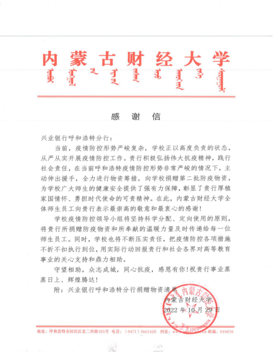 微光成炬,点滴成河。兴业银行呼和浩特分行将持续践行社会责任,为疫情防控工作提供坚强后盾,以责任显担当,以服务为宗旨,以爱心送温暖,以奉献为力量,共同抗击新冠疫情,共同守护美好家园。