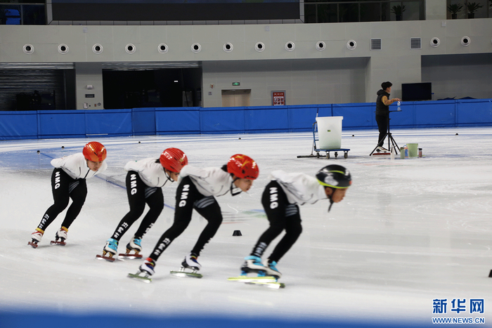 11月19日,短道速滑馆内运动员们正在进行日常训练。新华网 徐红梅摄