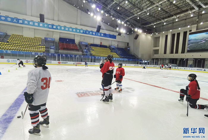 11月19日,运动员在“十四冬”冰球冰壶馆内进行日常训练。新华网发