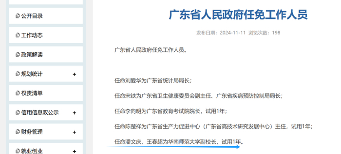 11月11日,广东省人力资源和社会保障厅网站主动公开消息:广东省人民政府任免工作人员。其中,任命潘文庆、王春超为华南师范大学副校长,试用1年。
