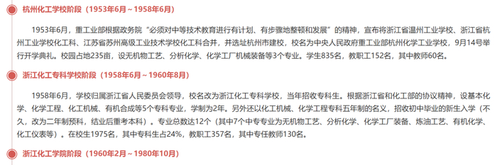 浙工大最初的起点便是从杭州“化工”学校开始的,之后经历了浙江化工专科学校、浙江化工学院、浙江工学院、浙江工业大学等5个发展阶段,每一阶段都与“化工”紧密相连。